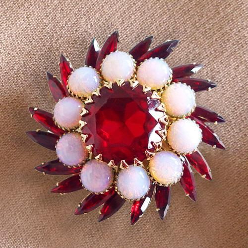 ![]() アメリカのコスチュームジュエリーメーカー、ジュディリーが製作したお花をモチーフにしたブローチ セットのイヤリングもあります中央に大粒の真っ赤なストーン、その周りにオパールのような 色合いのストーン、花びらの部分も深みのある赤いストーンが あしらわれています。