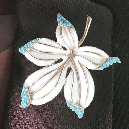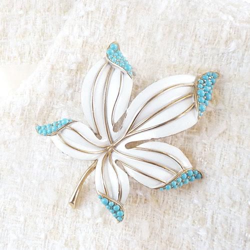 アメリカのコスチュームジュエリーメーカー、トリファリが製作した葉っぱのブローチ土台部分はゴールドカラーでその上からホワイトに色付けされています。葉先にはターコイズブルーのストーンがあしらわれています。 表、裏とも非常にきれいなコンディション。 裏側にはTRIFARIの刻印が確認できます。 ホワイト×ブルーの爽やかなカラーのブローチ。これからのシーズンにぴったり! ▶ 商品詳細★サイズ:7.5cm×6cm ★重さ: 34g ※10円玉1枚5g ★素材: プラスチック、合金 ★サイン:TRIFARI ★ コンディション:★★★★★ ▶ 詳細写真▶ 返品についてすべての商品、返品をお受けします。 下記の場合は返品をお受けできません ▶ 送料について15000円以上お買い上げの場合、送料は無料です。(一部離島を除く) [motif:flower][priceJ:-20000][color:white] |