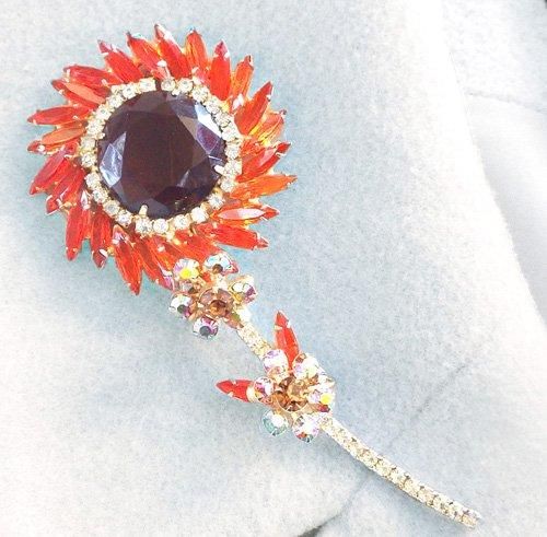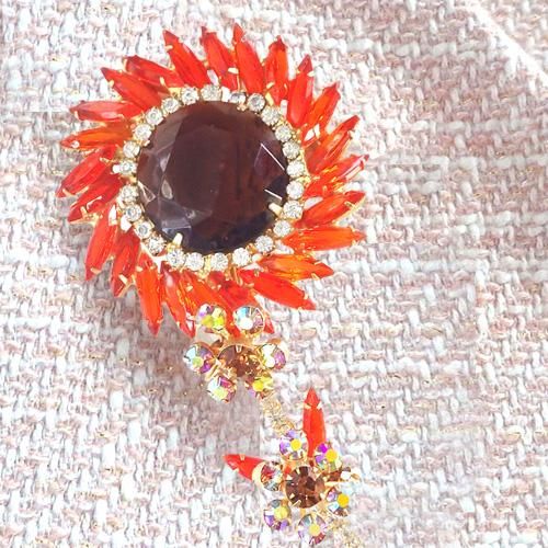 アメリカのコスチュームジュエリーメーカー、ジュリアナが製作した一輪のお花をモチーフにしたブローチです中央にブラウンのストーン、その周りにクリアとオレンジのストーン、茎の部分はライトブラウンとオーロラカラーのストーンがあしらわれています。 ストーンの状態もよく、全体的に 非常にきれいなコンディションです。 当時ジュリアナはタグをつけて販売していましたのでジュエリーにサインは入っていませんが、ジュリアナの本にも載っているデザインのブローチです。 コートやジャケットにつけるとオレンジカラーの一厘の花がとてもインパクトがあります。 ▶ 商品詳細★ サイズ:12cm×5.2cm ★ 重さ:39g ※10円玉1枚5g ★ 素材: ガラス、合金 ★ サイン: なし ★ コンディション:★★★★☆ ▶ 詳細写真 |