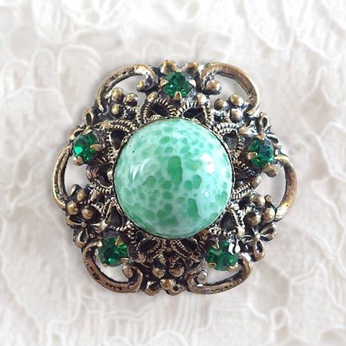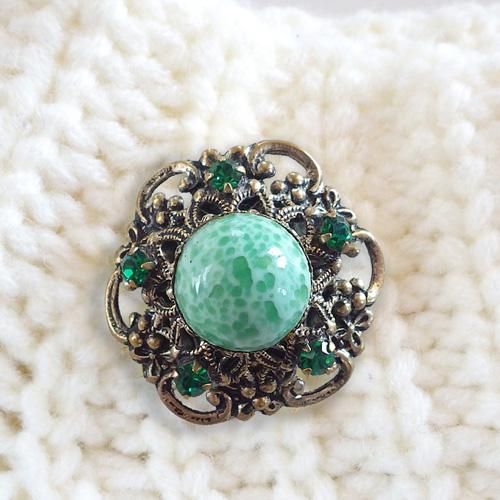 チェコで製作されたグリーンのガラスがあしらわれたヴィンテージブローチです。中央には淡いグリーンのガラスに緑の模様が入った高さのあるガラス、周りにグリーンのストーンがあしらわれています。 ストーンの状態もよく、きれいなコンディション。 小さめサイズで重さもありませんので、薄手の生地にもつけていただけます。淡いグリーンの色が上品です。 ▶ 商品詳細★ サイズ:2.8cm×2.8cm ★ 重さ:6g ※10円玉1枚5g ★ 素材: ガラス、合金 ★ サイン: なし ★ コンディション:★★★★★ ▶ 詳細写真 |